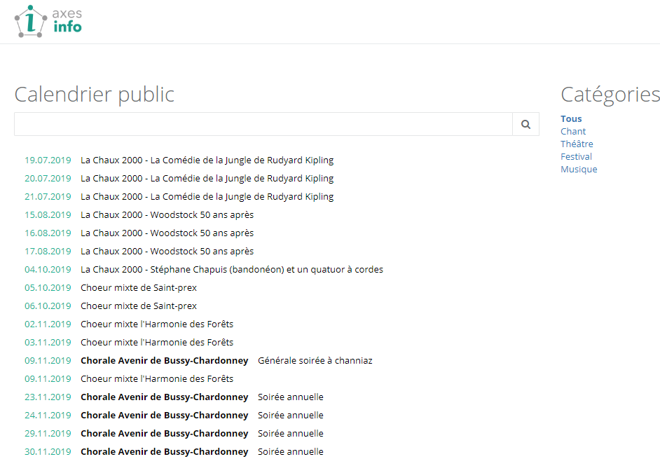 www.axesevent.ch est un calendrier ouvert sur Internet (tout le monde peut y accéder) pour y enregistrer vos événements publics