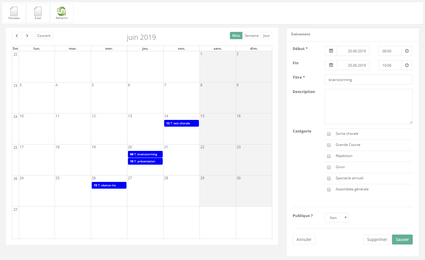 Afficher par jour, semaine ou mois, et par vue "calendrier" ou "liste"